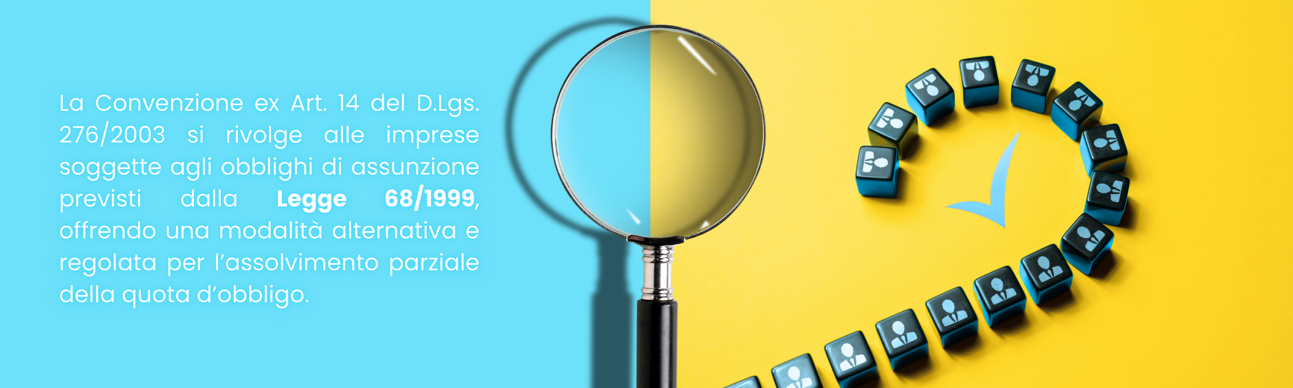 L’Articolo 14 offre alle imprese soggette agli obblighi della Legge 68/1999 una modalità alternativa, sicura e organizzata. per adempiere alla normativa, attraverso la stipula di una Convenzione con una Cooperativa Sociale di tipo B.